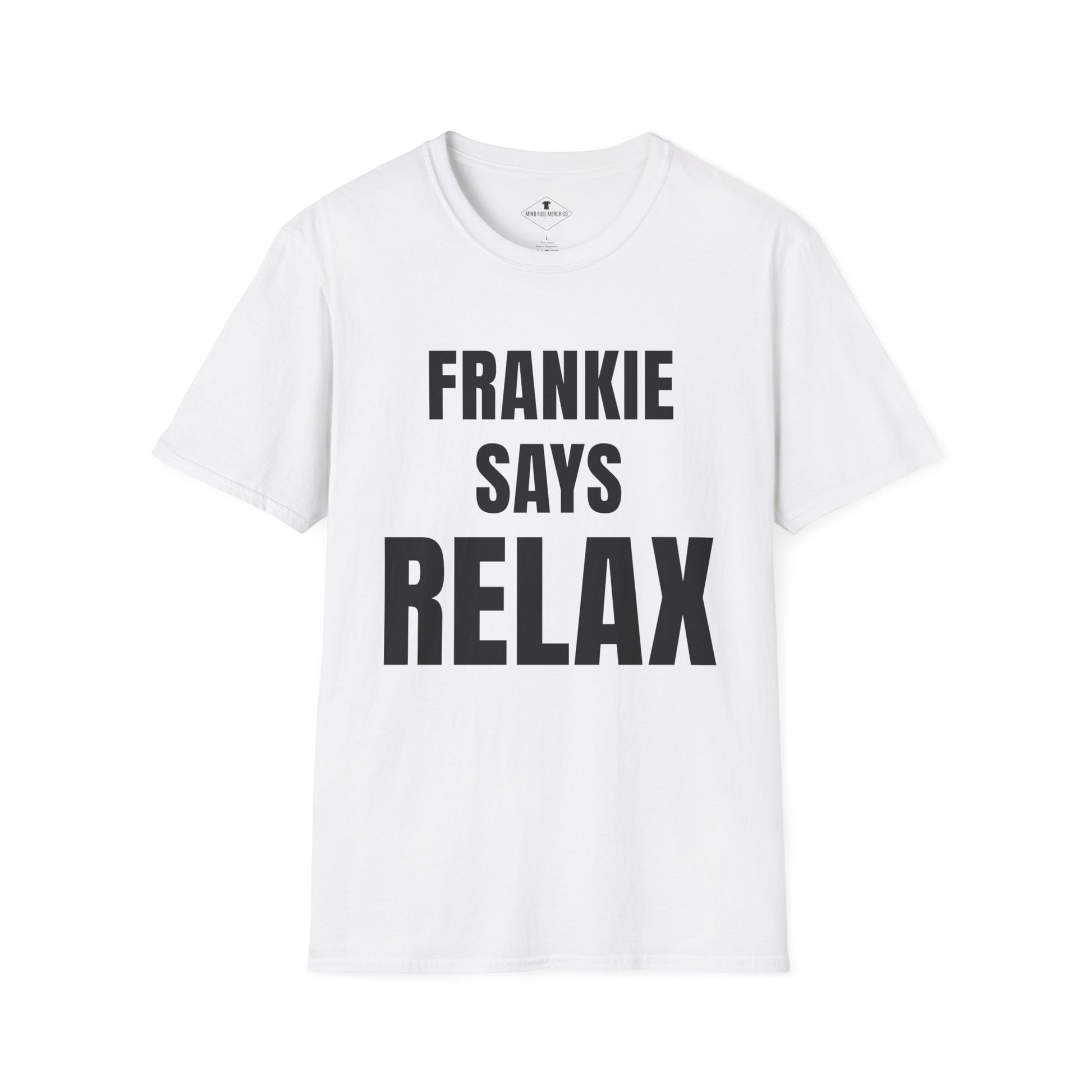 Frankie Says Relax 1980's design printed on the front of a white t-shirt