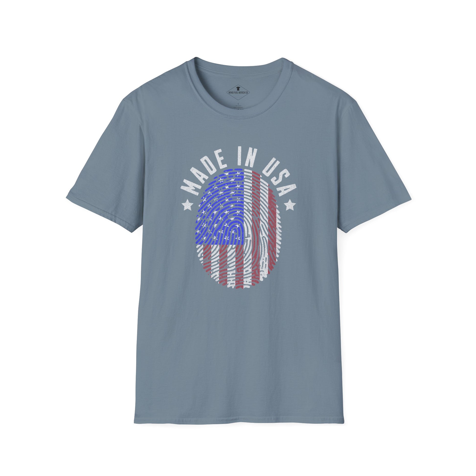 Made In USA Fingerprint design printed on the front of a slate blue t-shirt