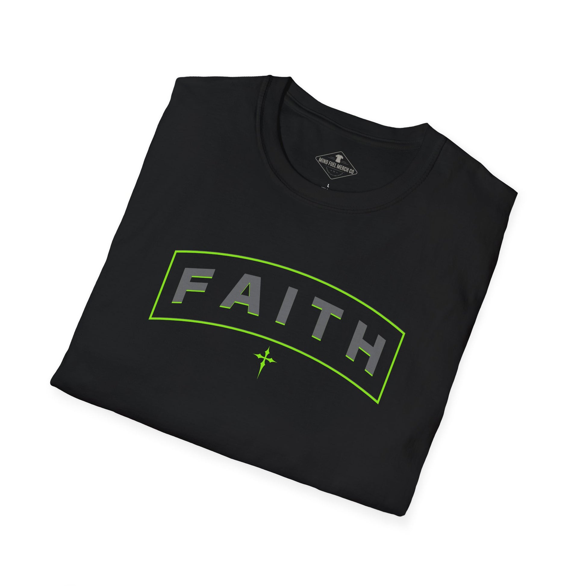Neon Faith design printed on the front of a black t-shirt
